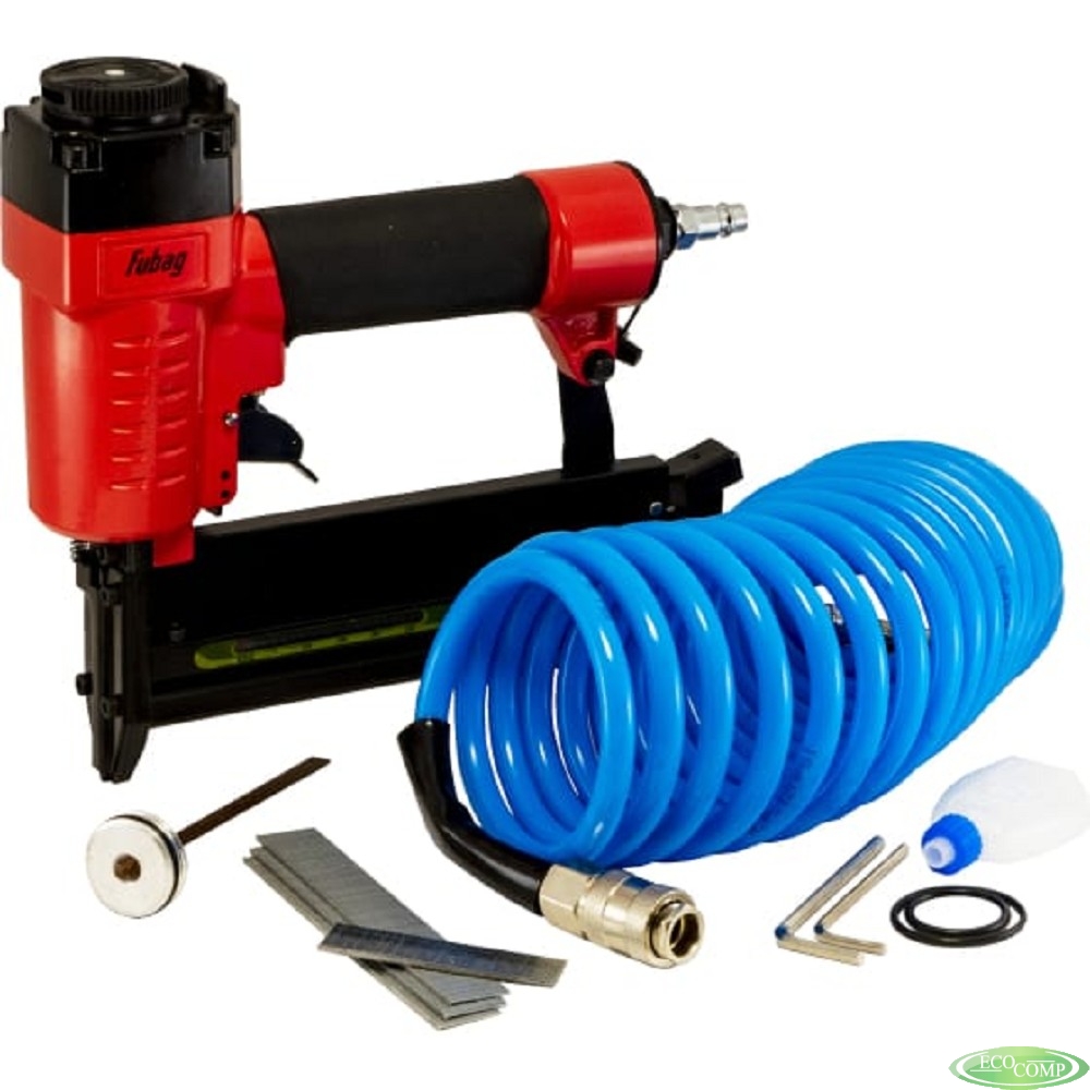 FUBAG Набор пневмоинструмента: пистолет SN4050, шланг 5 м, гвозди 15 мм, скобы 16 мм, боек [120106] {длина гвоздя 15-50мм_длина скобы_16-40мм_ширина скобы 5_7мм_1.05х1.25_100шт_23л/м}