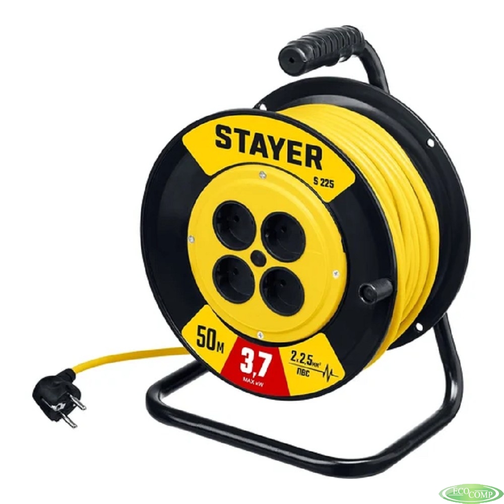 Удлинитель силовой Stayer 55070-50, розеток 4шт, 2x2.5 кв.мм, 10A, 50м, ПВС, катушка, желтый