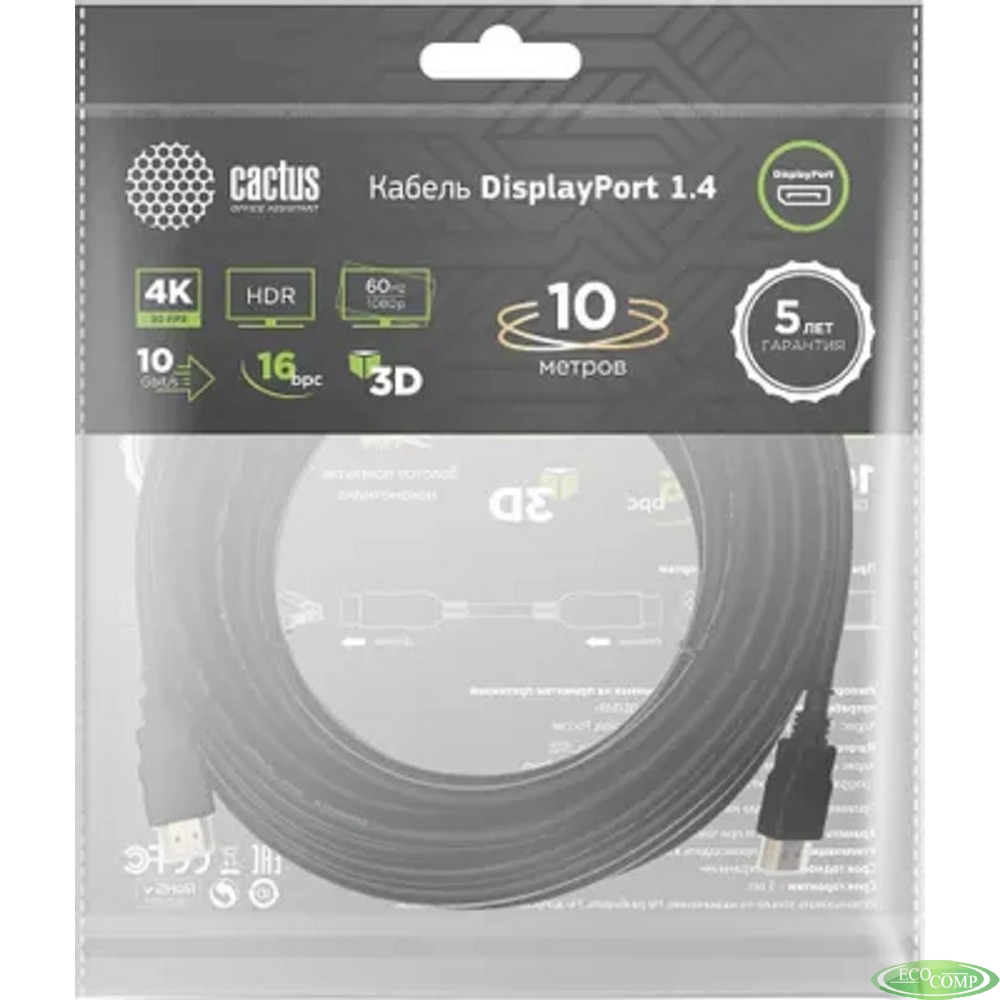Кабель аудио-видео Cactus CS-DP-DP-1.4-10 DisplayPort (m)/DisplayPort (m) 10м. позолоч.конт. черный