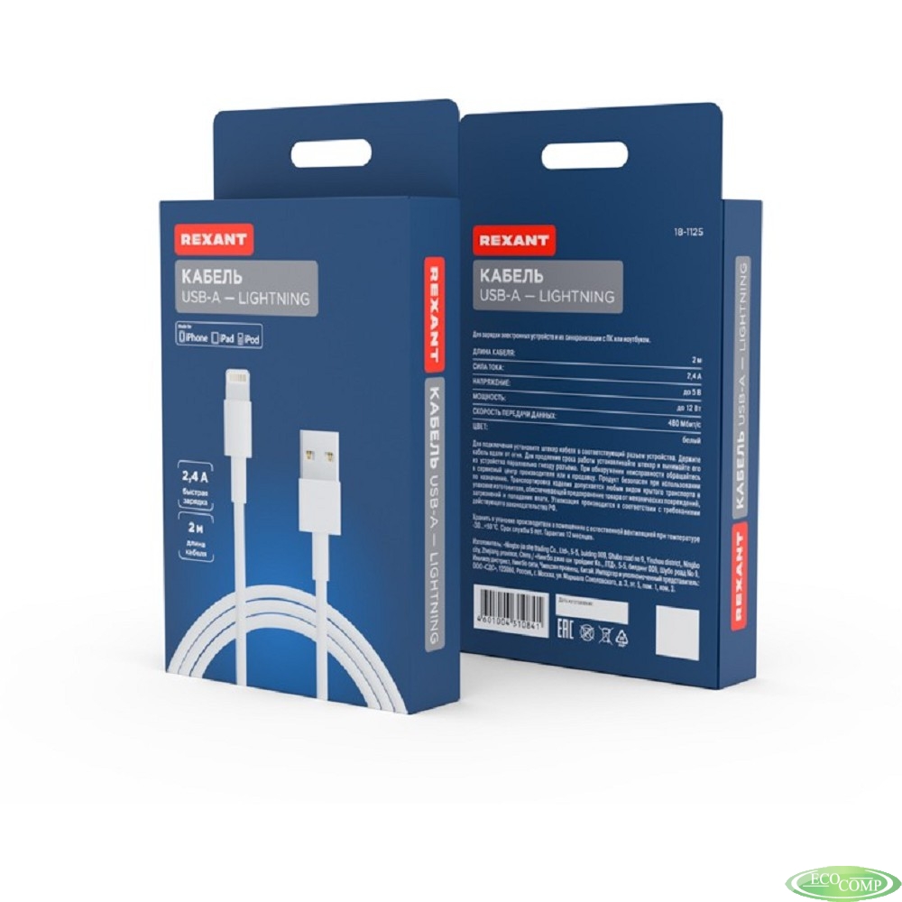 Rexant (18-1125) Кабель USB-A – Lightning, 2,4А, 2м, ПВХ, белый