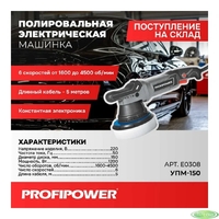 [Шлифовальная машина] Полировальная сетевая машинка вращательно-орбитальная PROFIPOWER УПМ-150 (150мм,1200Вт,1600-4500 об/мин, 21мм амплитуда, кабель 5м) [E0308]
